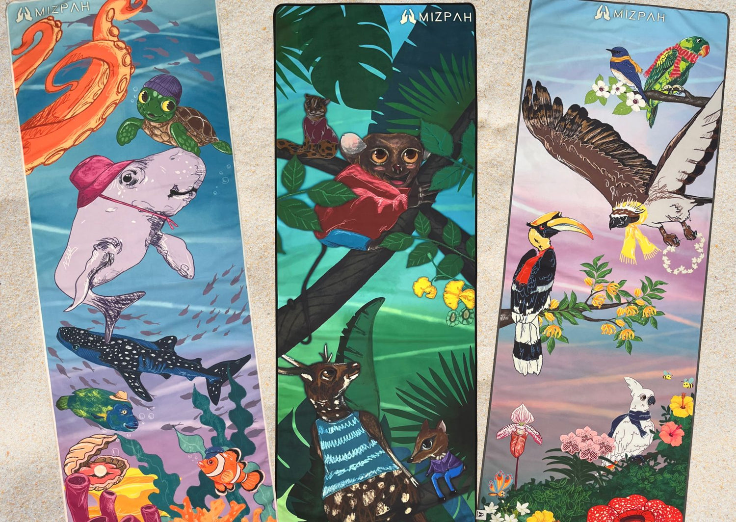 The Philippines is a biodiversity hotspot, home to a rich tapestry of life both above and below the waves. Three whimsical artworks on our new dual-sided multi-purpose yoga, travel and beach towels vividly illustrate this enchanting world, merging fun visuals with a serious message about conservation.